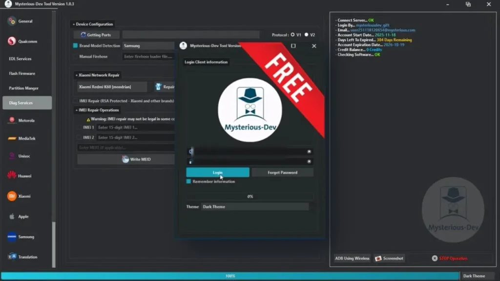 Mysterious-Dev Tool is a free tool for mobile phone repair. It supports major brands like Samsung, Xiaomi, Huawei, Motorola, and works with Qualcomm, MediaTek, and Unisoc devices. With this tool, you can remove FRP and SIM locks, flash firmware, repair IMEI, fix connection issues, and perform basic servicing tasks easily. The tool comes with pre-login access, so you only need to click the login button and start using it without any activation or payment.