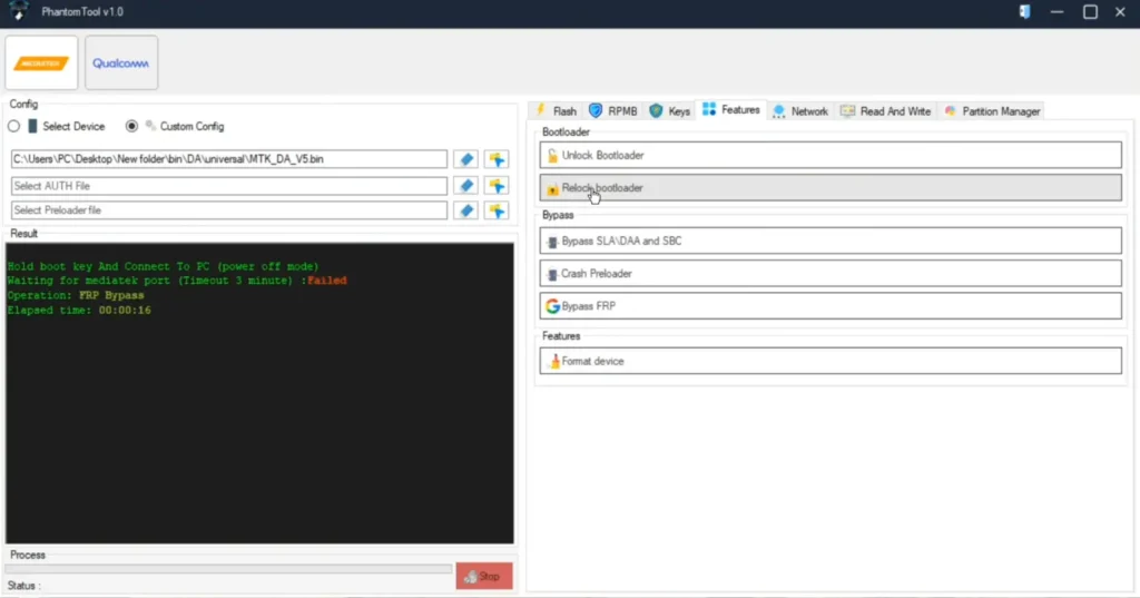 Phantom Tool v1.0 is a small but powerful Windows program made for phones with MediaTek and Qualcomm chipsets. It allows you to modify software, remove FRP or bootloader locks, and manage memory partitions directly from your PC. The tool is easy to understand and helps you perform deeper repairs without any complicated steps, making it a handy option for both beginners and technicians.